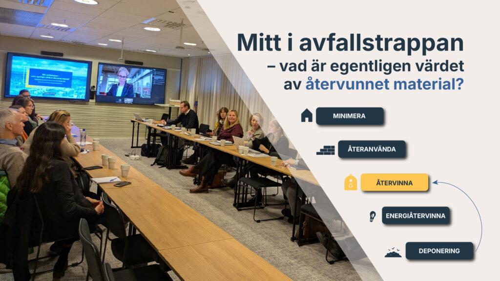 Ett stort tack till alla deltagare som medverkade vid vårt runda bordssamtal på temat ”Mitt i avfallstrappan – vad är egentligen värdet av återvunnet material?”. Samtalet samlade en bredd av aktörer från hela bygg- och fastighetssektorn för att diskutera förutsättningar, utmaningar och möjligheter kopplade till återvinning av byggmaterial och byggprodukter.